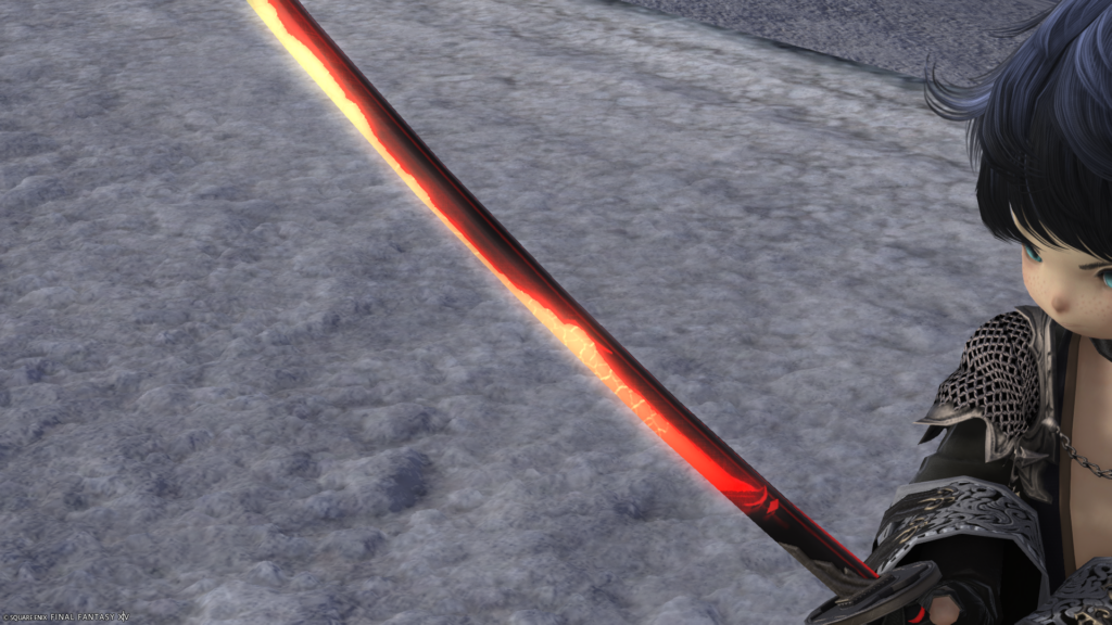 抜刀状態はこんな感じ 刀身は赤みを帯びていて波紋の部分が赤く発光していますね。
