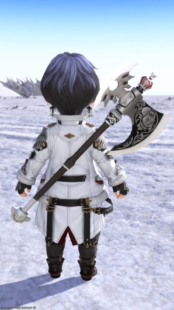 - 斧の刃は片側が大型で反対側には二股に分かれた小さい刃が付いたデザインとなっており、大きい刃の部分には王冠を被ったモーグリの彫刻が施されたデザインとなっています(*’▽’)