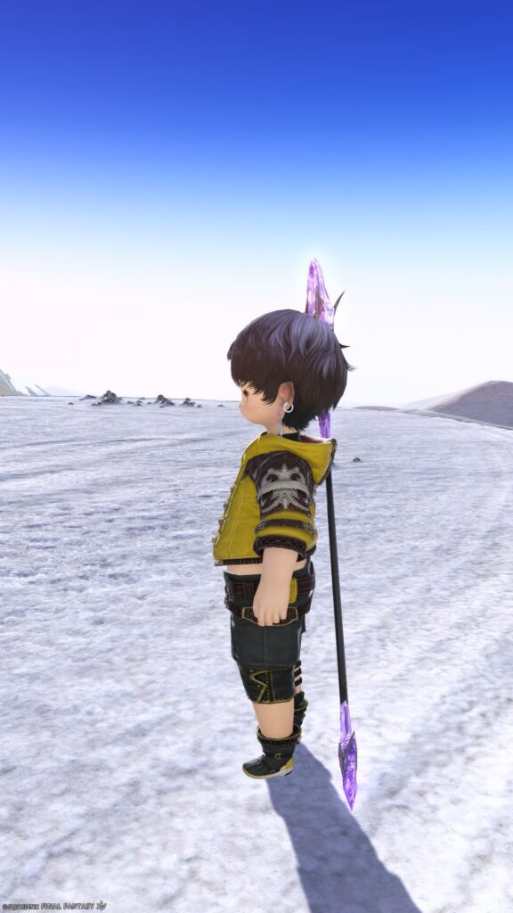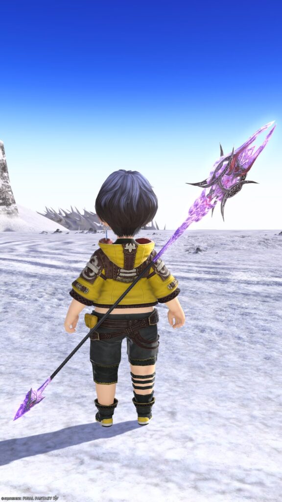 紫のクリスタルが特徴的な槍になっています。柄の部分は金属風の棒になっており、穂先と石突部分がクリスタルになったデザインです。